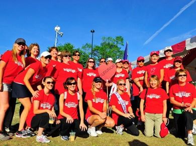 group of women wearing red